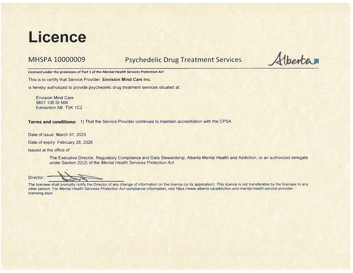 Envision Mind Care is a Psychedelic Drug Treatment Services provider accredited by the CPSA. For more information on this licensing see https://cpsa.ca/facilities-clinics/accreditation/psychedelic-assisted-psychotherapy/